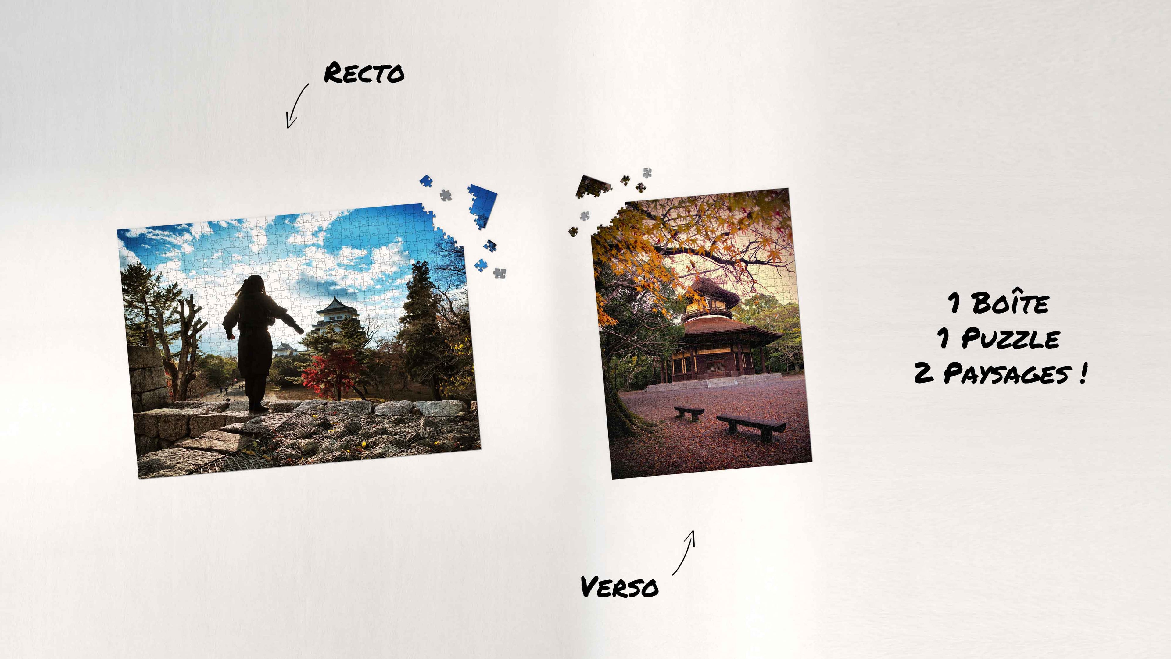 Poster recto/verso 70 x 50 cm pour vous aider à assembler le puzzle ou l’encadrer. Deux paysages réunis dans une seule boîte.